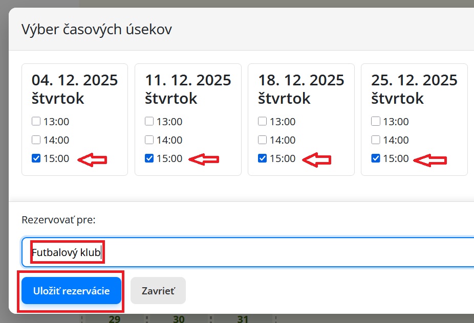 5. V danom dni zakliknite čas začiatku akci. Pre orientáciu napíšte, pre koho rezervujete a odkliknite "Uložiť rezervácie"