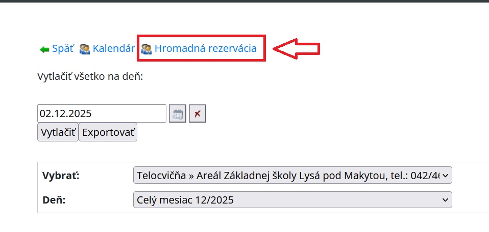 Hromadná rezervácia je naprogramovaná pre administrátora, aby si vedel hromadne v časenke zakliknúť dopredu dohodnuté podujatia. Napríklad: ak prenajímate telocvičňu, viete si dopredu obsadiť hromadne pre futbalový klub každý štvrtok v školskom roku od 17 do 18 hod . Viac v návode.