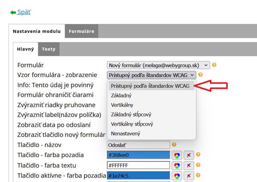 2. Pri úvodnom nastavení dotazníka na karte Nastavenie modulu vyberte možnosť "Prístupný podľa štandardov WCAG"
